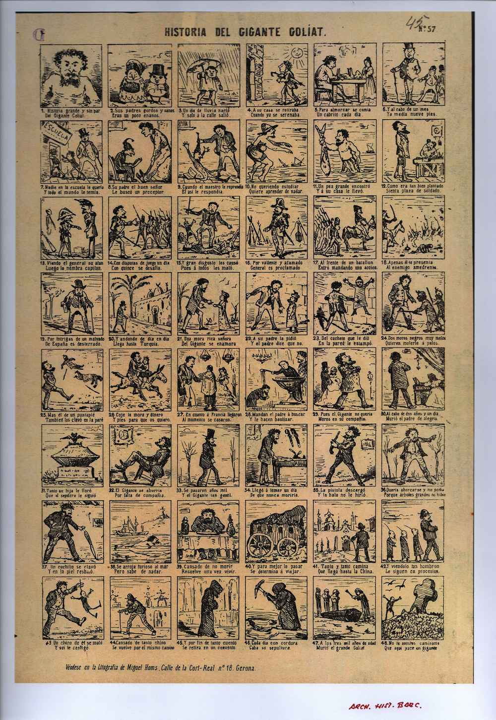 Viñetas: 48; 3,8 x 3,8; TF; Numeradas Formato: Pliego Vertical Técnica: Xilografía Imprenta: Vendese en litografía de Miguel Homs, Calle de la Cort-Real n.18 Gerona(Núm.58) Tipo: Narraciones Tema: Historias Fecha: Autor/es: Bibliografía: Notas: Original Localización: Colección Martínez Leis -FJD-