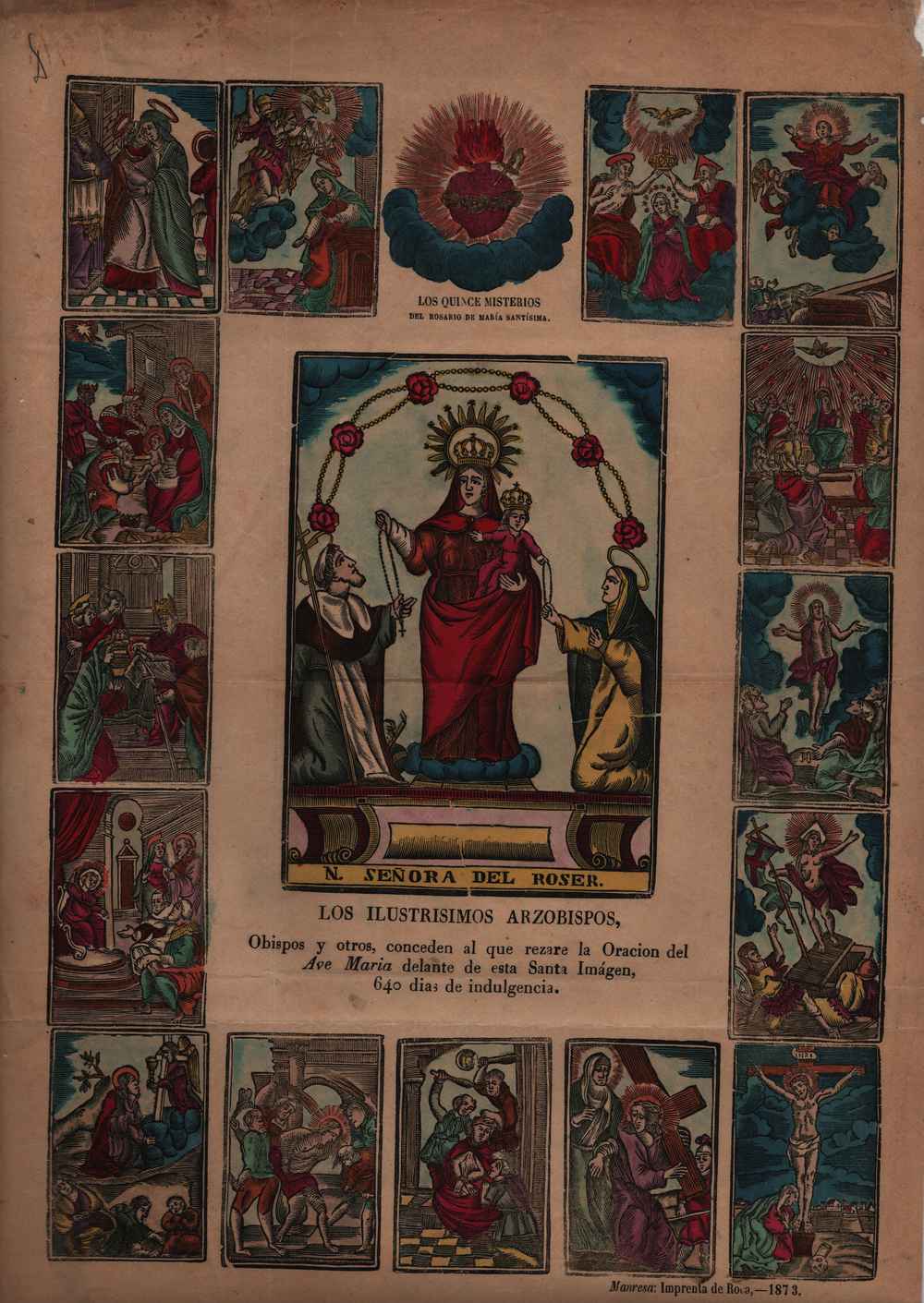Viñetas: varios tamaños. Formato: Pliego Vertical Técnica: Xilografía original coloreada Imprenta: Manresa: Imprenta de Roca Tipo: Figuras - santos Tema: Iconografía Religión Fecha: 1873 Autor/es: Bibliografía: Notas: Original Localización: Colección Martínez Leis -FJD-