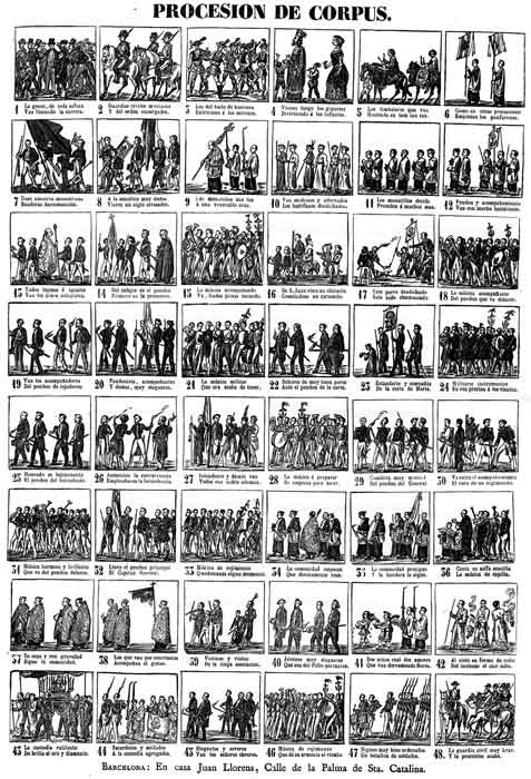 Viñetas: 48; 3.6x4.1; -TF- Formato: Pliego; Vertical. Técnica: Xilografía Imprenta: Barcelona: En casa de Juan Llorens, Calle de la Palma de Sta. Catalina. Tipo: Procesiones Tema: Religión / Iconografía Fecha: Autor/es: Cabanach (grabador) Bibliografía: Cabanach (grabador) Notas: Localización: -AMC-
