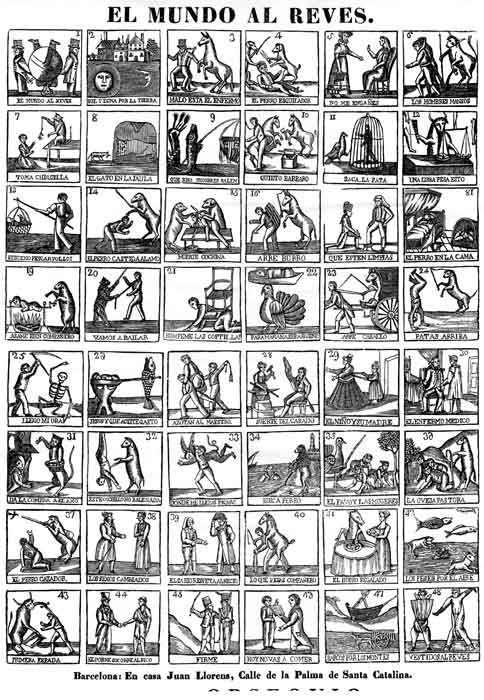 Viñetas: 48; 4.2x4.2; -TF- Formato: Pliego; Vertical. Técnica: Xilografía Imprenta: Barcelona: En casa de Juan Llorens, calle de la Palma de Sta. Catalina. Tipo: Satíricas Tema: Absurdos Fecha: Autor/es: Bibliografía: Notas: Obsequio Localización: -FJD-