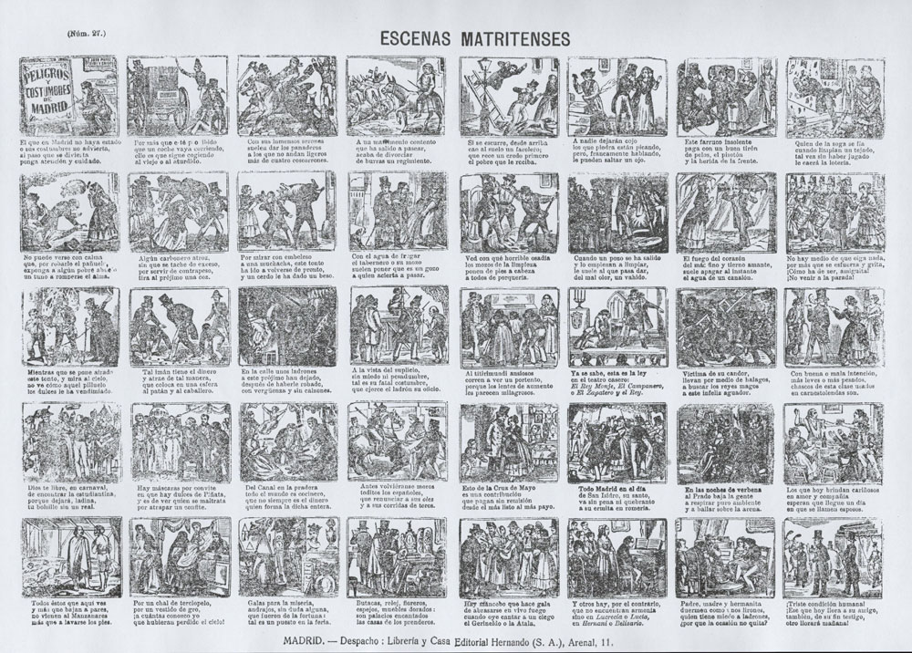 Viñetas: 44 + una más grande arriba; 4,2 x 4; -TD- Formato: Pliego Vertical Técnica: Xilografía Imprenta: Se vende en Madrid. Tudescos 18. Litografía. Tipo: Narraciones Tema: Historia Fecha: Autor/es: Bibliografía: Notas: Localización: -FJD-