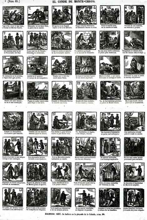 Viñetas: 48; 3.6x3.9; -TF- Formato: Pliego; Vertical. Técnica: Xilografía Imprenta: Imprenta de J.M.Marés, calle de Relatores, 17. Madrid. Tipo: Narraciones Tema: Literatura Fecha: Autor/es: Parece de Pérez Bibliografía: Parece de Pérez Notas: Hay un dato que “descubre” la autoría de Pérez y es el 1 del número 41 de las viñetas: casi siempre está grabado al revés Localización: -AMC-