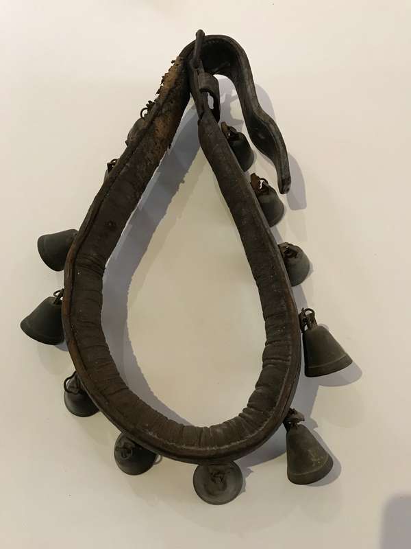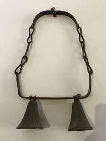 Campana de Colgar. Inscripción en latin. El colgador con gallo y ángel. Inscripción: “Vocem mean audit qui me tangit” En la campana motivos florales