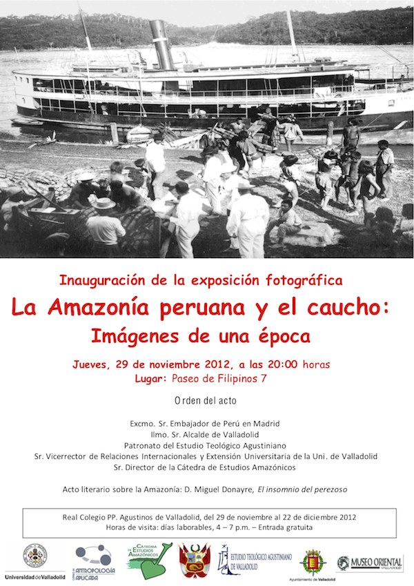 “... que la extracción cauchera en la Amazonía nos introdujo en la globalización económica de entonces. La resina extraída entre otros usos servía para la fabricación de las ruedas de los coches del norte económico. Pero esta introducción a la economía mundial produjo ansiedad y codicia entre los empresarios caucheros y como consecuencia, la deforestación del bosque amazónico y la sangrienta explotación de mano de obra indígena. A raíz de las denuncias de tratos inhumanos a indígenas en el Putumayo, Perú, se produjo, paralelamente, una guerra de imágenes. Ante la denuncia de los vejámenes a indígenas Uitoto, Boorá, Secoya se mostraron las imágenes de personas salvajemente torturadas y golpeadas que tuvo un serio impacto en la sociedad británica que para tales efectos se comisionó a Roger Casement para la elaboración de un informe sobre el tema. Recuérdese que la empresa gomera anglo-peruana de Julio César Arana contaba con socios británicos y por eso la intromisión del famoso Comisionado irlandés que venía del Congo. El famoso cauchero Arana, quien tuvo mucho poder en la Amazonía nor-oriental de Perú, ante esas imágenes que ponían en cuestión a su empresa, contó con los servicios de Silvino Santos, fotógrafo y cineasta luso-brasileño, quién le acompaño en un tour por las estancias donde se extraían esta materia prima. El propósito del viaje de Santos era mostrar una cara distinta a esas espinosas fotografías de las denuncias de esta explotación y son las que tenemos en esta muestra. Subrayar que el fotógrafo Silvino Santos vivió en Manaos hasta 1970, año que fallece. Era casado con una sobrina del cauchero Arana. Hizo el documental No Paiz das Amazonas. Se cuenta que filmó imagenes en las estradas caucheras, pero que lamentablemente yacen en elfondo del mar. En 1997 el cineasta brasileño Aurélio Michilis hizo una película sobre él titulada, El cineasta de la selva. Añadir que ninguna imagen fotográfica es inocente. Estas tienen intencionalidad. La intencionalidad la pone quien dispara con el objetivo de la cámara. Y esa dirección se muestra claramente en las imágenes que ustedes podrán verlas.