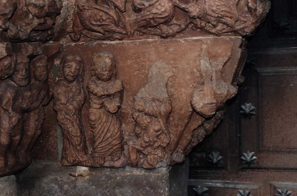 Portada occidental. Detalle de la mocheta que sustenta el tímpano en el lado izquierdo, con tres figuras femeninas en su cara exterior, un soldado con cota de malla en el ángulo, y otros dos personajes bajo arcos apuntado al intradós (los tres últimos muy deteriorados).