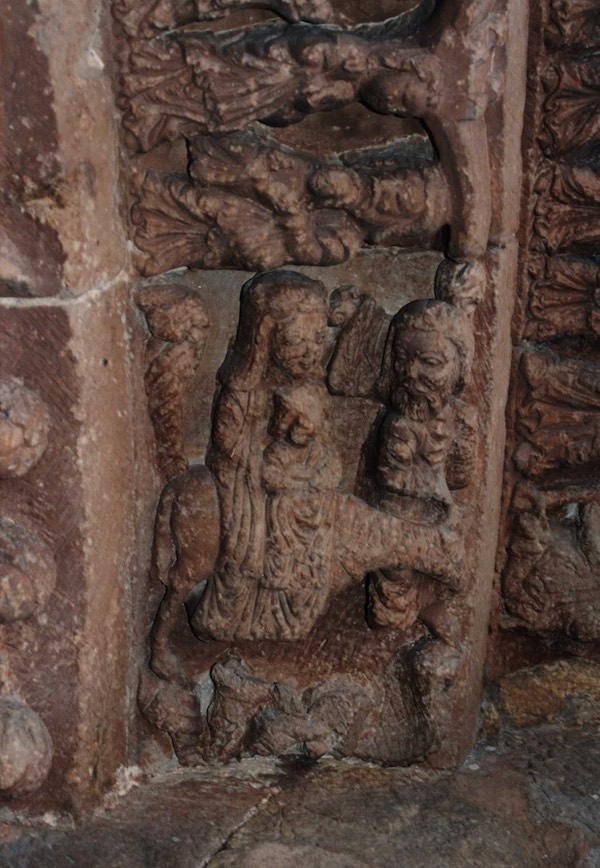 Portada occidental. Detalle de la última escena (huída a Egipto) de la tercera arquivolta, dispuesta de manera transversal al resto de figuras. Otras 11 dovelas que relatan diversos episodios del nacimiento e infancia de Cristo completan la arquivolta (todas las escenas, salvo tres, se representan bajo una sucesión de arquillos, capiteles y columnillas elaborados con todo detalle).