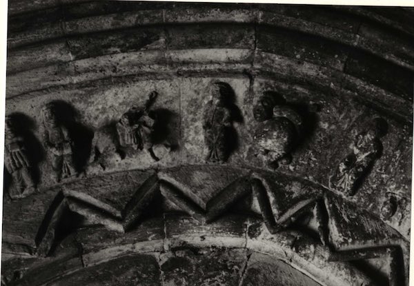 Portada meridional. Detalle de la arquivolta central con una serie de veinte figuras escultóricas en disposición radial: Entre ellas aparecen personajes de pie, otros sedentes sujetando un libro, un caballero y algún monstruo androcéfalo. / Imagen invertida /