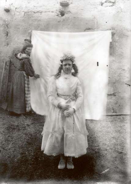 Fotografía de dos mujer y niña con traje de comunión