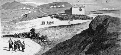 Título: Acontecimientos militares en el Norte. ( Apuntes remitidos por nuestro especial artista Sr. Pellicer). Combate del 25 de febrero. Situación del ala derecha del ejército a las doce de la mañana. 1. Sitio donde se hallaba el general Primo de Rivera cuando fué contuso. 2. Fuegos carlistas. 3. Posiciones carlistas. 4. Posiciones tomadas por las tropas. 5. Soldados y camilleros. 6. Batería. Carretera a Portugalete y Bilbao