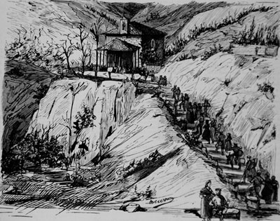 Título: Crónica ilustrada de la Guerra. Aramayona (Álava). Peregrinación de heridos carlistas y sus familias a la ermita de la Virgen de Andra-María
