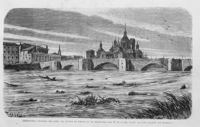 Título: Zaragoza. Lanchas prestando auxilio a los habitantes del arrabal (vistas tomadas del natural)
