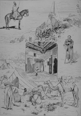 Título: Recuerdos de Tánger. 1. Soldado marroquí. 2. El Cabo Espartel. 3. Judío marroquí. 4. Patio del Hotel Hadida. 5. El zoco grande