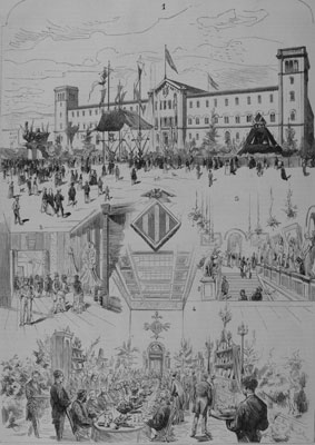 Título: Barcelona. Exposición de productos catalanes en obsequio a S. M. el Rey. 1. Exterior de la nueva Universidad donde está instalada la exposición. 2. Sección de hilados y tejidos. 3. Aspecto de la escalera principal. 4. Banquete en honor de S. M., celebrando despues de la inaguración de la exposición, el 4 del actual. (Cróquis por D. A. Rigal)
