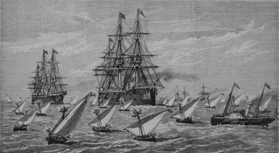 Título: Viaje de S. M. el Rey. Santa Pola. Llegada de la escuadra Real, escoltada por lanchas del país adornadas con palmas