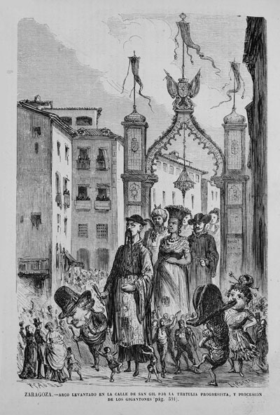 Título: Zaragoza. Arco levantado en la calle de San Gil por la tertulia progresista y procesión de los gigantones