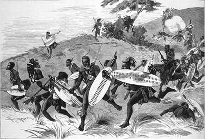 Título: África del Sur. Guerreros zulús cargando al enemigo