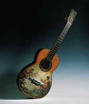 La guitarra es un instrumento de seis cuerdas, tendidas a lo largo de un mástil y de una caja plana en forma de ocho, que se tensan entre un clavijero y un cordal que va encolado en la parte más ancha de la caja. De la primitiva guitarra, con caja excavada en un tronco de madera y cuatro cuerdas, se evolucionó, por sucesivos pasos a la forma y encordado actuales. Muchas guitarras del siglo XVIII se decoraban con incrustaciones de nácar y exquisitos trabajos de marquetería. Algunas del XIX se pintaron al óleo, ofreciendo muy bellos acabados que enriquecían artísticamente el instrumento aunque modificaran negativamente su sonido. El ejemplo que se ofrece fue fabricado en Madrid por "Hijos de González" con anterioridad a 1890.
