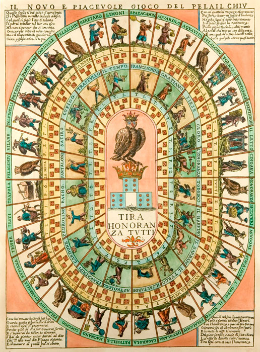 El juego del mochuelo o de la lechuza parece basarse en juegos de adivinación como el denominado en España e Italia «Juego de las suertes», en el que, con tres dados, se hacían preguntas a una especie de oráculo y unos profetas daban las respuestas. Como se puede observar, el mochuelo está sobre la corona del escudo de los Medici, por lo que pudiera pensarse que procede el tablero de la misma corte que se supone introdujo el juego de la oca en España. la primera documentación que se conoce del juego de la oca en nuestro país procede de la época de Felipe II, a quien Francesco de Medici envía el juego como obsequio. Las «T» de este tablero significan que el que caía en esa casilla debía llevarse la cantidad que se indicaba en ella y la «P»que debía ponerla en el centro, donde se instalaba una bolsa. El que sacaba los tres dados con 6 se llevaba el bolsín total y recomenzaba el juego. Las indicaciones están en las cuatro esquinas del tablero.