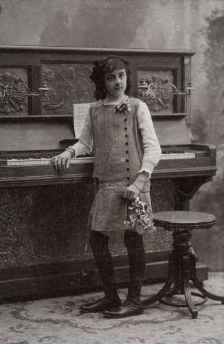 La niña que aparece en esta fotografía utiliza el piano como punto de apoyo y deja caer lánguidamente el ramillete en una postura perfectamente afectada. Fotografía de la Fundación Joaquín Díaz.