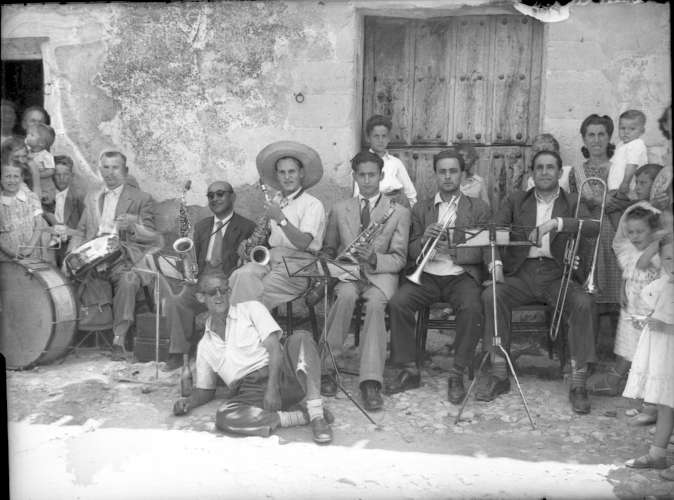 Músicos de diferentes edades componen esta banda, seguramente fluctuante entre los clásicos pasodobles bailables y el jazz. Muchos grupos surgieron en la Ribera del Duero en los años 20 del siglo pasado al abrigo de las melodías foráneas que transmitía el gramófono con exótica seducción. No sabemos si quien está a los pies de los artistas es un amigo que se ha tumbado a la sombra o el ideal de vocalista, pero quienes forman el grupo están con sus armas en la mano -saxofones, trompeta, baquetas de batería, trombón de varas o sacabuche- y esperan pacientemente la hora del baile que se prolongará mientras queden parejas vivas.