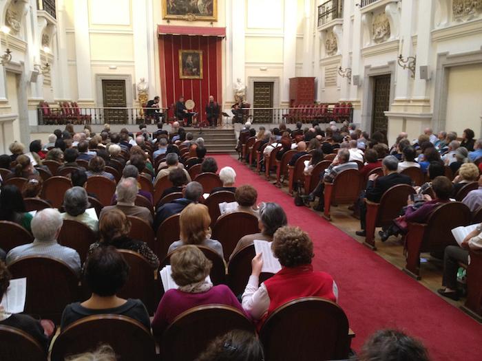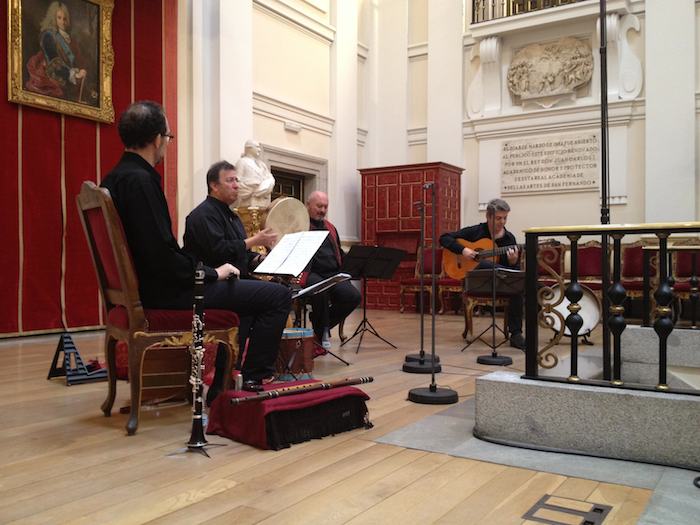 En el salón de Actos de la Real Academia de San Fernando de Madrid se celebró el sábado pasado un concierto sobre “Romances de las dos riberas”, en conmemoración del 300 aniversario de la fundación de la Real Academia de la Lengua. Con la presencia de Académicos de ambas instituciones y con la sala abarrotada de público, el Quarteto de Urueña (Luis Delgado, César Carazo, Jaime Muñoz y Josete Ordóñez) interpretó cerca de veinte temas del género romancístico en un concierto que se transmitió por Radio Clásica y por la Unión Europea de Radiodifusión con la finalidad de mostrar la riqueza patrimonial de la música hispana. Las notas al programa fueron redactadas por Joaquín Díaz que intervino al comienzo de la retransmisión para explicar la evolución de los romances en tierras americanas y su uso continuado a lo largo de los últimos