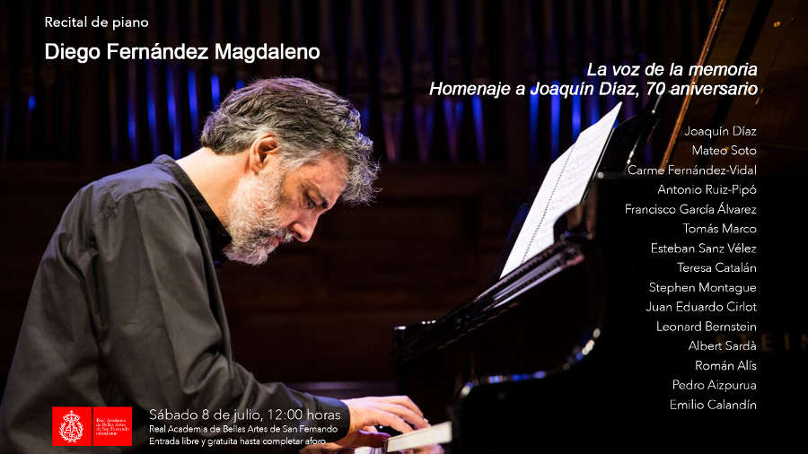 El pianista Diego Fernández Magdaleno ofreció el día 8 de julio en el salón de actos de la Real Academia de Bellas Artes de San Fernando, un recital de piano como homenaje al músico y etnógrafo Joaquín Díaz, en conmemoración de su septuagésimo aniversario.