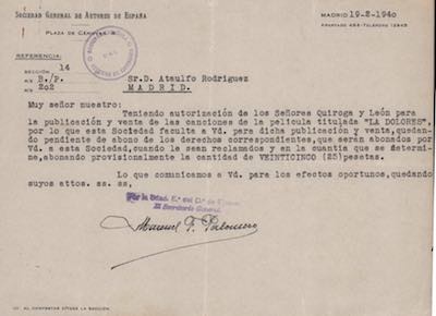 Incipits: Sr D. Ataulfo Rodríguez. Muy Señor nuestro: Teniendo autorización de los Señores Quiroga y León para la publicación y venta de las canciones de la película titulada “La Dolores”