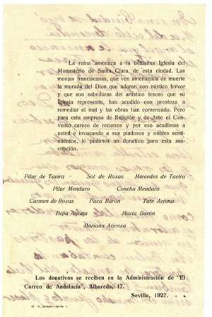 Observaciones: La primera parte está impresa y es una petición de donativos para la rehabilitación del Monasterio de Santa Clara y la segunda son unos versos manuscritos sobre la Anunciación